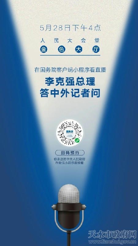 2020年5月28日(星期四)16时,国务院总理李克强将在人民大会堂三楼金色大厅出席记者会并回答中外记者提问。